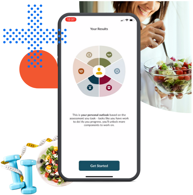 The app experience begins with a health assessment. After a quick round of multiple choice questions, the app presents you with your daily challenges, which are designed to help you develop healthy habits. As you move along, your daily challenges remain on your home screen so you can update your progress with ease.
